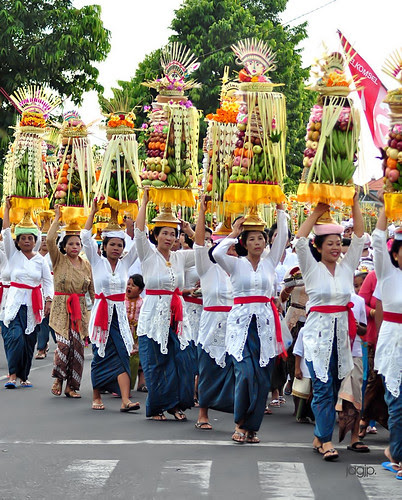 This offering is consisted of many kind of fruits, flowers and other ornaments that is arranged from bigger to smaller to form the required shape. It is not just the artistic or aesthetic value of a person needed to make beautiful gebogan, we have also to be patient to stick one by one of the fruits or flowers to its ‘core’ (made from the stem of banana sapling).